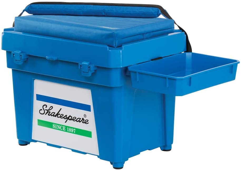 The Shakespeare "Fully loaded" seat box in blue is a perfect starter fishing seat box for young or old anglers. It comes complete with side tray, padded carrying strap and tiny little feet to ensure the box is slightly raised from the ground.